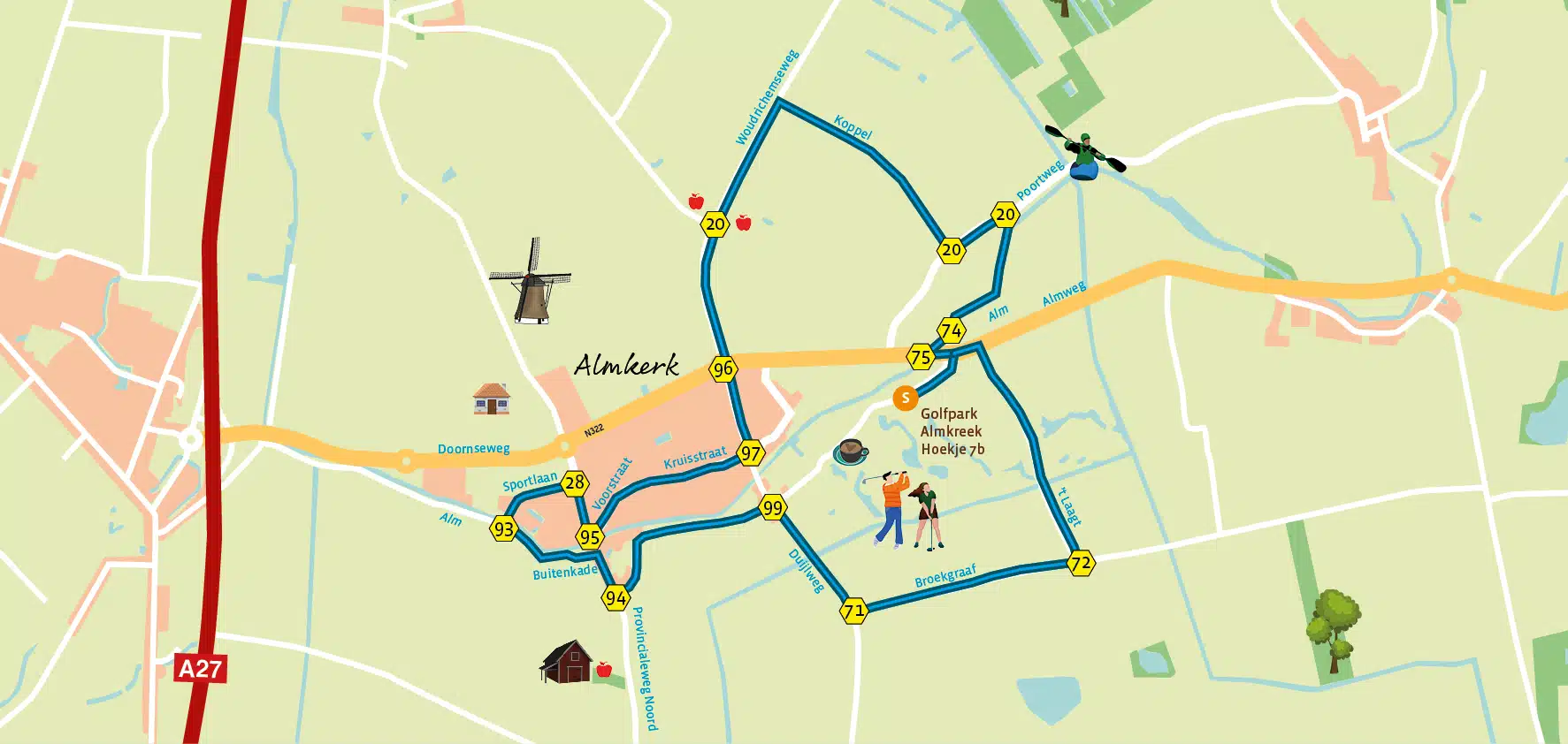 De route begint bij Golfpark Almkreek en loopt langs het riviertje de Alm waar van kunstenaars uit de streek rustbanken zijn geplaatst. Het dorp Almkerk kent prachtige historische verhalen over de rivier De Alm, weleer een breed water waar schepen op voeren. De restanten doen meer denken aan een sloot en de nazaten van de voormalige zeebonken zitten nu aan de waterkant te vissen. Overigens wel een leuke plek voor een picknick! Bijzonder is bioscoop Hollywoud, langs de provinciale weg (richting de A27). Een gezellig filmhuis waar je tijdens de voorstelling drinken en lekkers kan bestellen. Houd je meer van het buitenleven? Ga dan sportief ‘aan de slag’ op Golfpark Almkreek. Tijdens deze wandeling loop je langs delen van dit golfpark. Je loopt langs boerderij De Koppel die in de Eerste Wereldoorlog een belangrijke rol speelde (zie ook onze fietsroute Fietsen & verhalen langs de linie). Langs de Woudrichemseweg passeer je landgoed Clootwijck; een locatie die streekproducten verkoopt. Je wandelt door het dorp en via de Broekgraaf en over ’t Laagt terug naar Golfpark Almkreek.