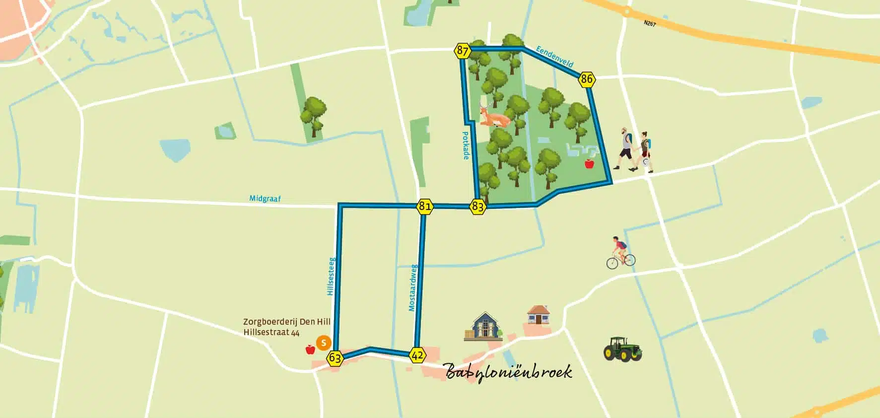 De wandeling begint bij zorgboerderij Den Hill. In het schuurtje aan de straat worden producten uit de tuin verkocht. Je loopt richting het dorp om bij knooppunt 63 de bovenliggende polder te ontdekken. Je bent onderweg naar het Pompveld, een gebied van 239 hectare dat met rust gelaten is tijdens de grote ruilverkaveling die aanving in de jaren ‘60 van de vorige eeuw. Een prachtig natuurgebied waar je reeën, zilverreigers en haviken op je pad kunt tegenkomen. Er zijn tal van bankjes en picknickplaatsen te vinden waar je je onderdompelt in de stilte en heerlijk tot rust komt.