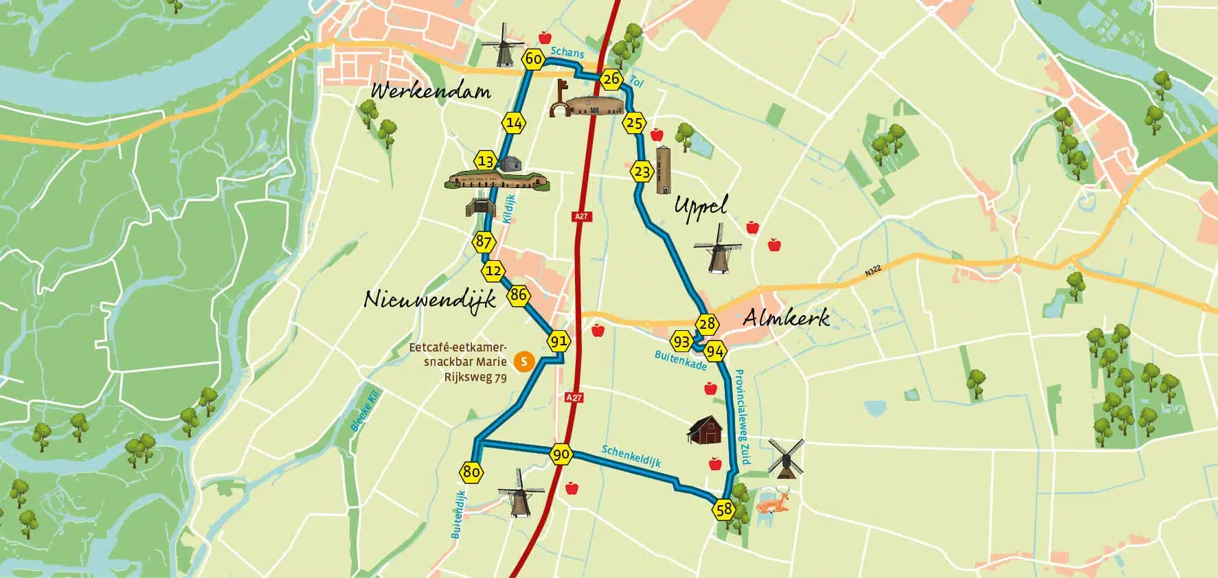 Je wandelt langs molen De Vervoorne Polder naar de andere zijde van de A27, waar Fort Altena ligt. Ook dit fort maakt deel uit van de Nieuwe Hollandse Waterlinie en is je bezoek meer dan waard. De weg vervolgt over een slingerende dijk door het dorp Uppel richting het zuiden. Onderweg kom je een aantal molens tegen en als een molen draait, kan je een bezoekje brengen. De molenaars laten je graag zien hoe alles werkt. Op deze route kom je boerderijen tegen waar producten verkocht worden. Net voor Dussen ga je weer westwaarts en loop je terug naar Nieuwendijk.
