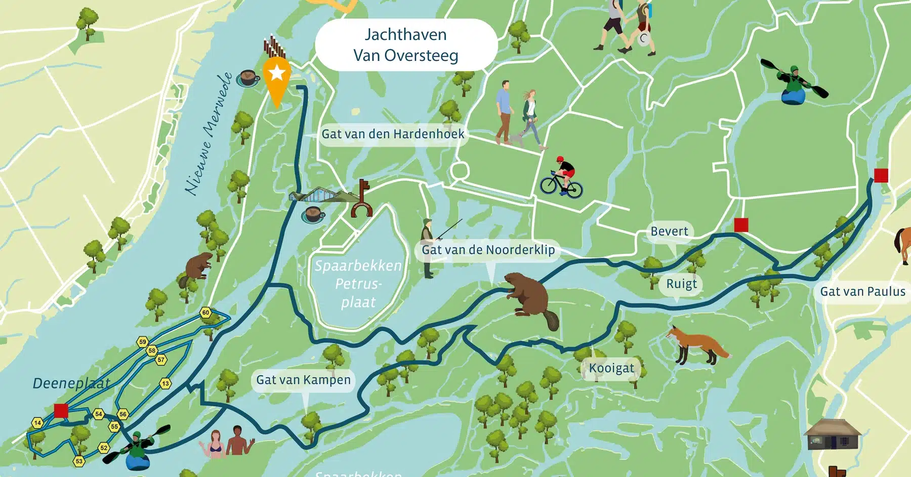 Als je een route vol afwisseling zoekt, dan is dit een aanrader. Omdat de route door smalle kreekjes en over breder vaarwater gaat, krijg je te maken met stroming. Echt een tocht voor de sportieve kanoër. Je kunt voor deze route een dag uittrekken. Even aanleggen om te picknicken kun je op de strandjes en om de benen te strekken is een wandeling op de Deeneplaat een aanrader. In elk jaargetijde is het er verrassend mooi, zelfs op koude, grijze dagen. Er groeien maar liefst zo’n 130 soorten planten. Sommige met prachtige namen, zoals look zonder look, vogelmelk en reuzenbalsemien. De laatst genoemde komt van oorsprong uit de Himalaya en kan wel drie meter hoog worden. De paarse bloemen bloeien uitbundig in augustus.
