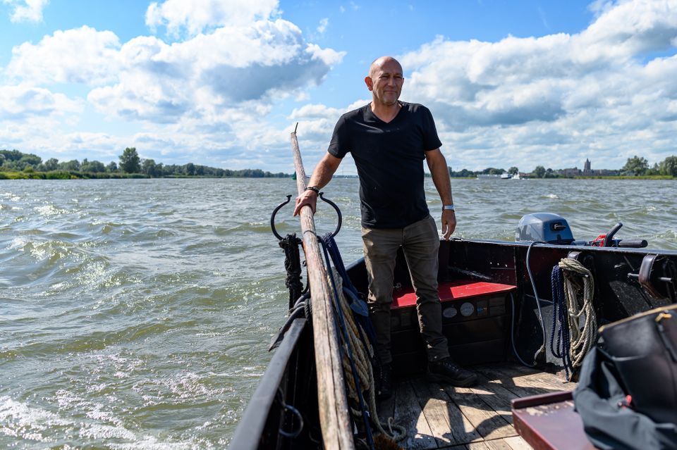 Het waait nog steeds stevig en de boot duikt de golven van de Boven-Merwede op. Een platbodem schuit is zo stabiel dat ze zelfs zeewaardig is. Zorgen maak ik mij niet met een ervaren schipper als Arjan aan de helmstok. Het opspattende water stuift om ons heen, de zon droogt het weer op. Veel te snel naar mijn zin, is het tijd om terug te keren.