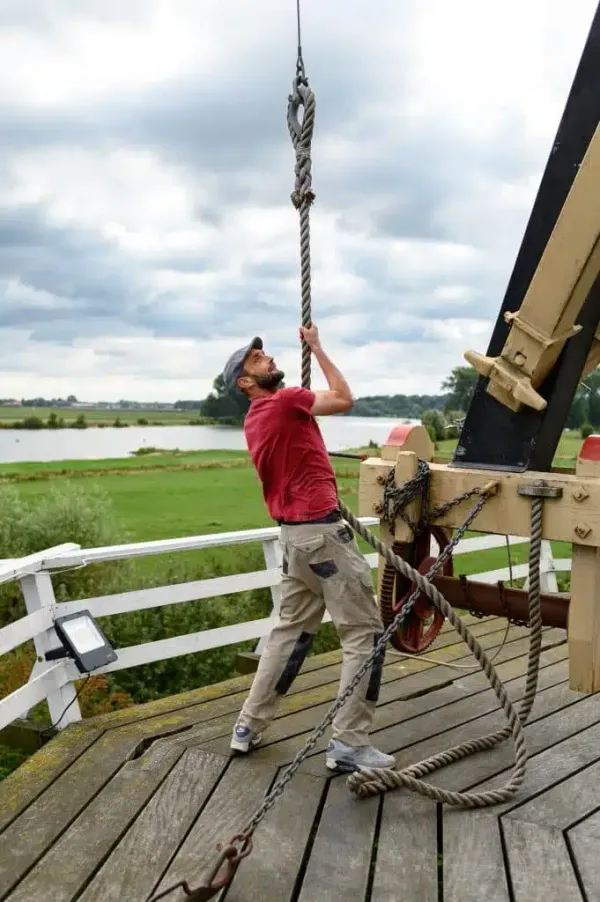 Sven gaat mij voor de smalle, houten trappen op naar boven en geeft onderweg uitleg over het proces. Niets gaat verloren blijkt op de graanzolder, na het zeven van het meel blijven er zemelen over die weer apart verkocht worden. Sven laat op de galerij zien hoe snel hij de wieken af kan remmen. Het uitzicht hier buiten is werkelijk prachtig. De Afgedamde Maas maakt een draai en de zon glinstert op het water. Een zeilschip glijdt rustig tussen de dampende oevers door.