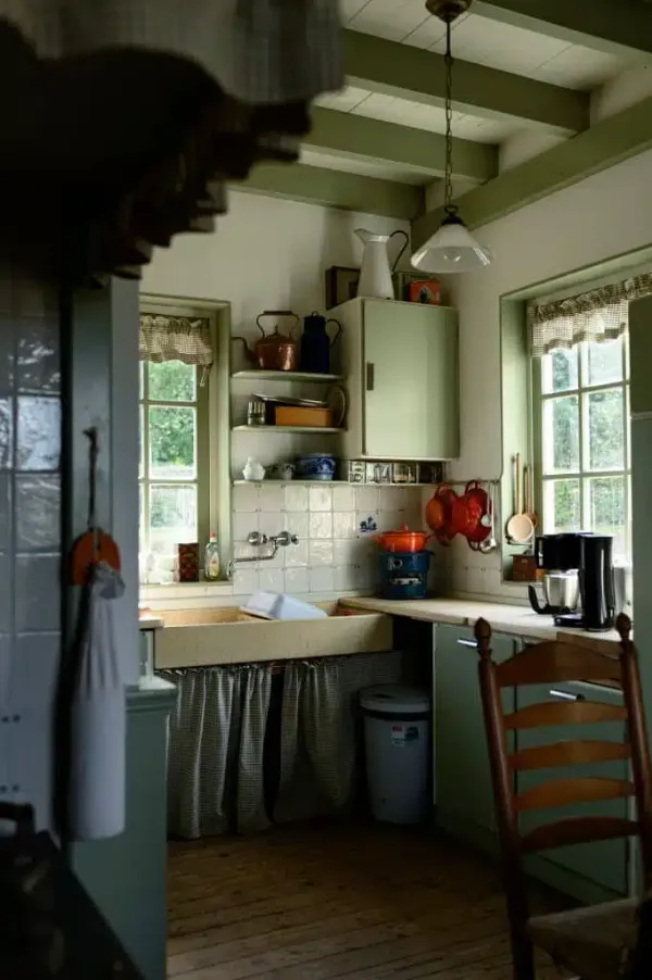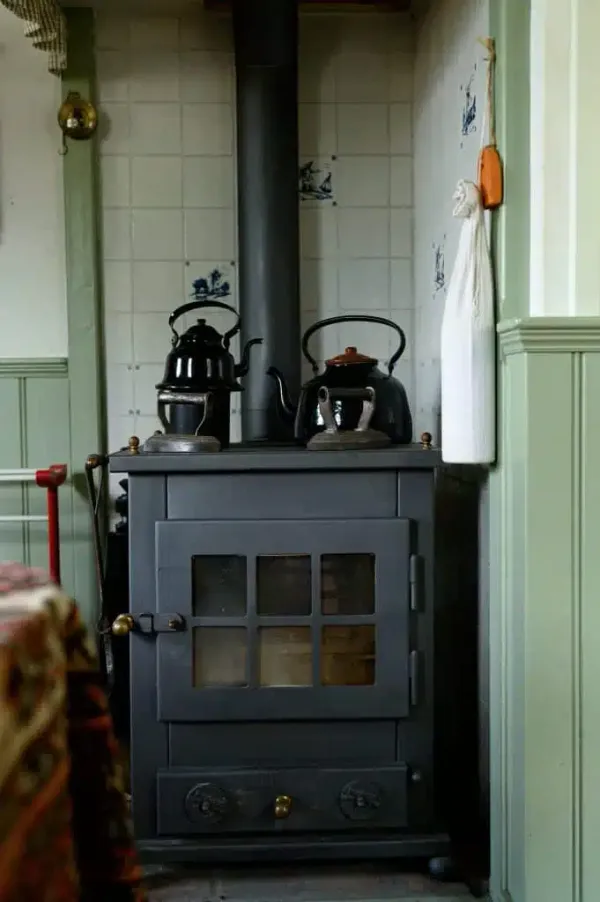 Arjan gaat een deur door die ik nog niet gezien had. Erachter blijkt een keuken te zitten die helemaal op maat gemaakt is naar voorbeelden van vroeger. Zachtgroene kastdeurtjes, tegeltjes met Oud-Hollands motief en een houtkachel om de boel warm te houden in de winter. Na samen aan tafel gekletst te hebben vraagt hij of ik het een goed idee vind om een rondje te varen. Voor een boottocht ben ik altijd te porren. Gelukkig is het precies droog geworden buiten.