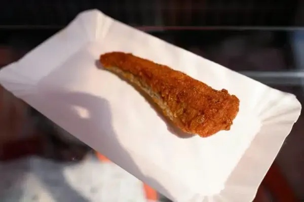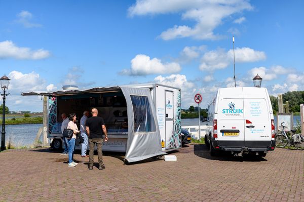 Voordat we de haven indraaien, leggen we aan bij de steiger voor de Rijkswal van Woudrichem. De vissers groeten ons en laten een paar kleine vissen zien die ze gevangen hebben. Zelf gaan we een visje eten bij de viskar van Wiljo Struik. Na jaren op het water gezeten te hebben als visser, heeft hij nu een goedlopende vishandel. Op de vraag wat er lokaal veel gegeten wordt, krijg ik het antwoord dat dat toch wel de gebakken poon is. Wiljo maakt er eentje voor ons klaar, knapperig van buiten en boterzacht van binnen.