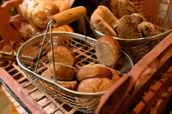 De dijk af, een zijstraat in en ik sta voor Bakkerij Hardeman. Zo dicht bij de molen is het dus! Gerard en Suus zijn een begrip in de omstreken. Met glimmende ogen vol passie, geeft Gerard mij een kijkje in de bakkerij waar een zachte geur van gist mijn neus in kringelt. Op hoge rekken staan de oranje rijsmandjes opgesteld. De bakkers laten het brood lang rijzen, dit komt de smaak ten goede. Daarmee moeten ze goed samenwerken met het weer. Is de luchtvochtigheid hoog in de zomer? Dan zal het brood sneller rijzen.