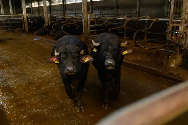 Monique is al snel terug, samen lopen we een rondje door de stallen. Waarom waterbuffels? Daar ben ik wel nieuwsgierig naar. Het antwoord daarop is vrij eenvoudig. Richard is opgegroeid op een boerderij. Nadat hij Monique ontmoette, zijn ze samen het avontuur aangegaan in het buitenland. Na Denemarken en Duitsland keerden ze terug naar Altena, met twee kinderen erbij. "Buffels vereisten geen fosfaatrechten, en we wilden iets nieuws proberen" legt Monique uit. "Het was voor ons allemaal erg wennen in het begin. Voor ons, maar ook voor de dieren zelf." De vele uren, liefde en geduld, werden beloond. De buffels zijn nu zo gewend dat ze zelfstandig de melkrobot instappen, daar is bijna geen omkijken meer naar nodig.