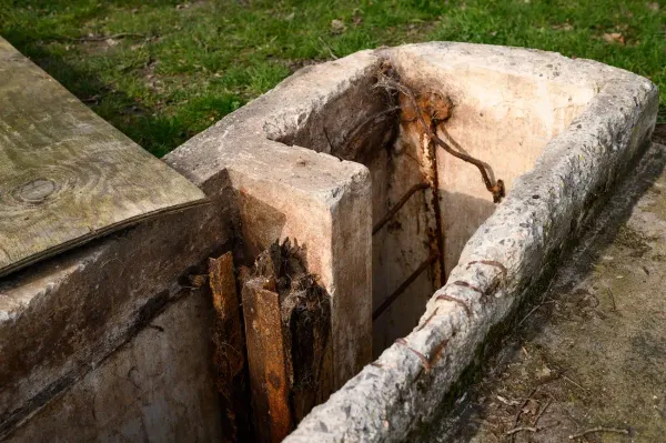 Er is nog iets wat ik moet zien. Buiten op het terrein, vlak naast het fort ligt een oude schietbaan. In het gras heeft Arie twee vierkante tuintegels neergelegd. "Dat zijn de 50 en 100 meter afstanden", vertelt Arie geestdriftig verder. In een betonnen kelder zaten een paar mensen die de schietdoelen op en neer konden bewegen. Was er geschoten, dan haalden ze het doel naar beneden en gaven door aan de commandant wat de resultaten waren. Geen prettig karweitje, als je daar beneden zat konden de kogels je om de oren vliegen. Wellicht was het soms ook wat saai, want we zien meerdere inkervingen in een houten balk. '18 Maart '55', kan ik met moeite ontcijferen. Bij de geheime operatie Gladio waren burgers betrokken. Die moesten kostte wat het kost hun mond houden, zelfs hun gezinsleden wisten vaak van niets. Om deze mensen te trainen in het gebruik van vuurwapens werd er wellicht gebruik gemaakt van deze schietbaan.