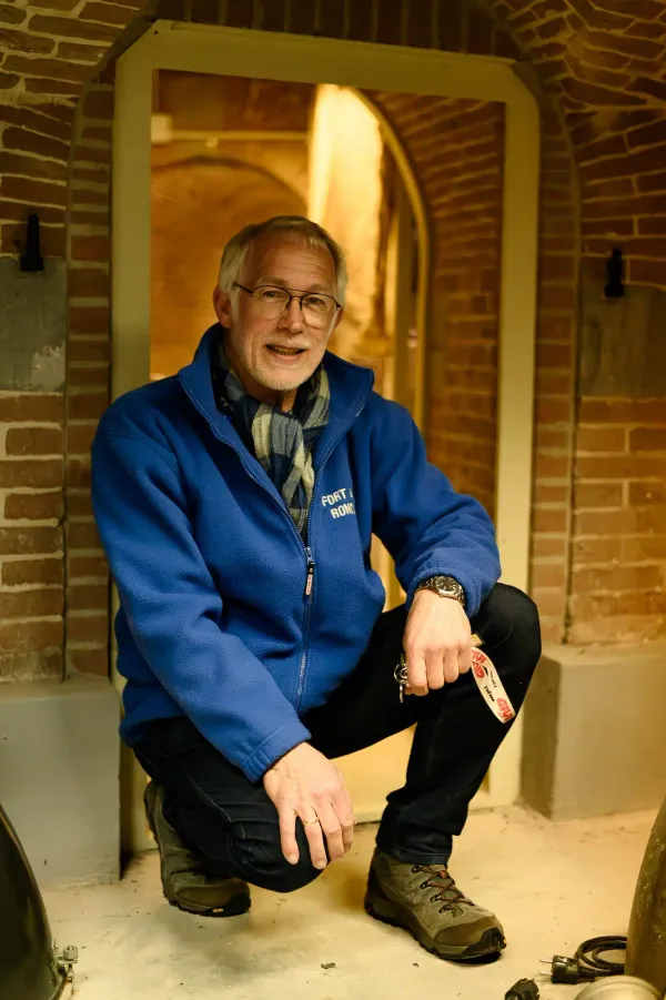 Een stevige handdruk en een grote lach breekt door op zijn gezicht als Arie mij welkom heet in het horecagedeelte van fort Altena. Vroeger heette dit "het fort aan de Uppelse dijk", gaat hij gelijk van start. "Het ronde gedeelte werd als eerste gebouwd, het zogenaamde torenfort. In 2001 werd Brabants Landschap eigenaar, toen ze de sleutels overhandigd kregen van defensie, ontdekten we hier een aantal eigenaardigheden. Kom maar mee, dan laat ik het je zien".