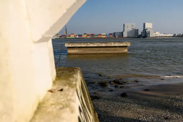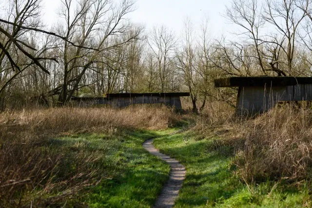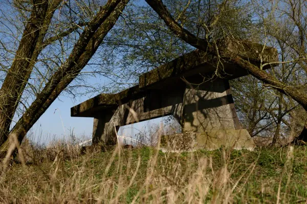 Een smal pad voert de dijk af en slingert het natuurgebied de Sleeuwijkerwaard in. Het duurt niet lang of ik kom de eerste pijler al tegen. Een machtig betonnen bouwwerk, middenin het groen. Best indrukwekkend. Ik tel elf stuks, de laatste staat op een hellend strandje aan de rivier. Sommige zijn overwoekerd door de natuur, anderen zijn goed te bekijken. Als zo'n brug eenmaal opgebouwd werd, kon het enorm veel hebben. Zware vrachtauto's, militaire voertuigen... het maakte allemaal niet uit. Uiteindelijk zwakte de oorlogsdreiging af en is de NATO-brug nooit daadwerkelijk in gebruik genomen. Wel weten we dat hij ook nog een keer getest is. Dus hier heeft zeker een brug gelegen en dat is helemaal niet zo lang geleden als je denkt!