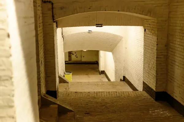 We lopen het daglicht in richting het grote, cirkelvormige gebouw wat in het midden van het fort ligt. Een doorgang geeft toegang tot een kleine ronde binnenplaats. Via een glazen deur lopen we een kleine ruimte in. Meerdere deuren volgen, ieder geeft toegang tot unieke kamers. "Kijk, hier kan je goed zien dat er een betonvloer in is gestort", vertelt Arie verder. "Die vloer is veel recenter gemaakt dan de aanleg van het fort zelf. Ook troffen we electriciteit, telefoonaansluitingen en zelfs tl-verlichting aan!