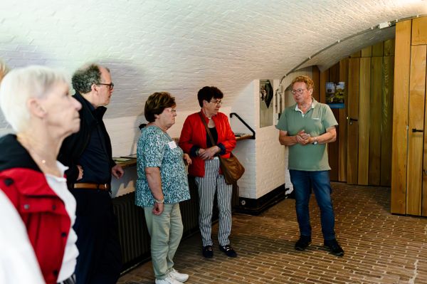 Gelach klinkt op als we allemaal droog de overkant halen. Hier vind je het educatiepark van Fort Giessen. Mijn gids gaat uitgebreid in op wat er te zien is. Er is een groepsschuilplaats nagebouwd en op een heuvel is een luisterput ingegraven. Een soldaat hield de wacht of hij vijandelijke vliegtuigen aan hoorde komen. Was dat het geval, dan gaf hij een sein en dook zelf in de krappe put om te schuilen. Je moest geen claustrofobie hebben als soldaat!