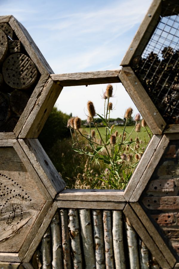 Als je over de dijk fietst, heb je van bovenaf goed zicht op het landschap dat doorsneden wordt door de hagen. Nu weet jij waarvoor die dienen! Halverwege is een brede strook grond ingezaaid met allerlei bloemen en planten. Nu de eerste tekenen van het najaar zich aandienen zitten de kaardebollen vol met zaadjes. Puttertjes zijn er dol op! Stap gerust eens af en neem een kijkje. Er staat een enorm insectenhotel waar nog steeds veel bedrijvigheid te zien is. Je kunt er langs de haag lopen en uitrusten op het bankje van Brabants Landschap.