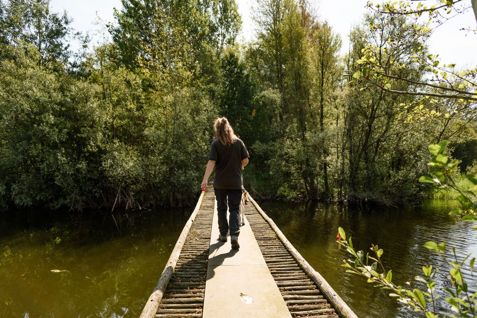 De lucht trilt en zindert boven het water van de grote poel die we passeren. Ondanks dat het nog vroeg is, voel ik al dat het een warme dag gaat worden. Enkele zwaluwen scheren rakelings over onze hoofden. Voor me hoor ik de zompige voetstappen van beheerder Kelly. Haar hond Marly is enthousiast dat ze mee mag en springt ongeduldig om ons heen. We zijn met zijn drieën op pad in de Struikwaard, een natuurgebied langs de Afgedamde Maas. Kelly is beheerder (een soort boswachter) van Brabants Landschap en neemt mij vandaag op sleeptouw om me alles te vertellen over dit gebied.