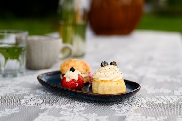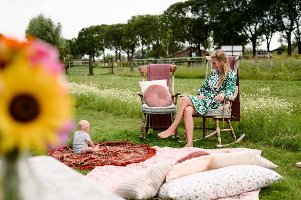 Het plukgedeelte van de tuin staat inderdaad vol met bloemen die roepen om geplukt te worden. Zachte tinten wedijveren met de hardere kleuren van de cosmea. Aan de rand van de tuin zijn verschillende zitjes opgesteld. Stoelen waar je heerlijk in weg kunt zakken met talloze kussens eromheen vormen een idyllisch plaatje. Alle zoetigheid die geserveerd wordt, maakt Willeke zelf in haar keuken. Scones, cakejes, gevulde aardbeien en macarons, ze draait er haar hand niet voor om.