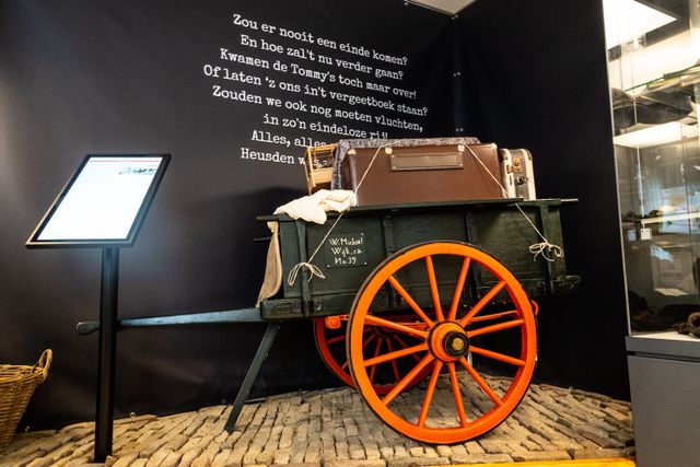 De verhalen blijven binnenkomen. Op een digitaal scherm lees je het verhaal van een vrouw uit Babyloniënbroek. Daarnaast staat een gerestaureerde hondenkar. “Deze kar is van de familie Van Bergeijk uit Wijk en Aalburg,” vertelt Peter Willem. “Begin 1945 zijn ze ermee geëvacueerd naar Poederoijen en uiteindelijk zelfs naar Friesland. Na de oorlog keerden ze terug, met deze kar. Die is nu in bruikleen bij ons.”