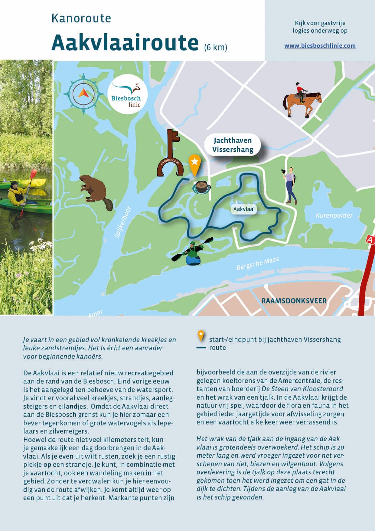 Hoewel de route niet veel kilometers telt, kun je gemakkelijk een dag doorbrengen in de Aakvlaai. Als je even uit wilt rusten, zoek je een rustige plek op een strandje. Je kunt, in combinatie met je vaartocht, ook een wandeling maken in het gebied. Zonder te verdwalen, kun je hier eenvoudig van de route afwijken. Je komt altijd weer op een punt uit dat je herkent. Markante punten zijn bijvoorbeeld de aan de overzijde van de rivier gelegen koeltorens van de Amercentrale, de restanten van boerderij De Steen van Kloosteroord en het wrak van een tjalk. In de Aakvlaai krijgt de natuur vrij spel, waardoor de flora en fauna in het gebied ieder jaargetijde voor afwisseling zorgen en een vaartocht elke keer weer verrassend is.