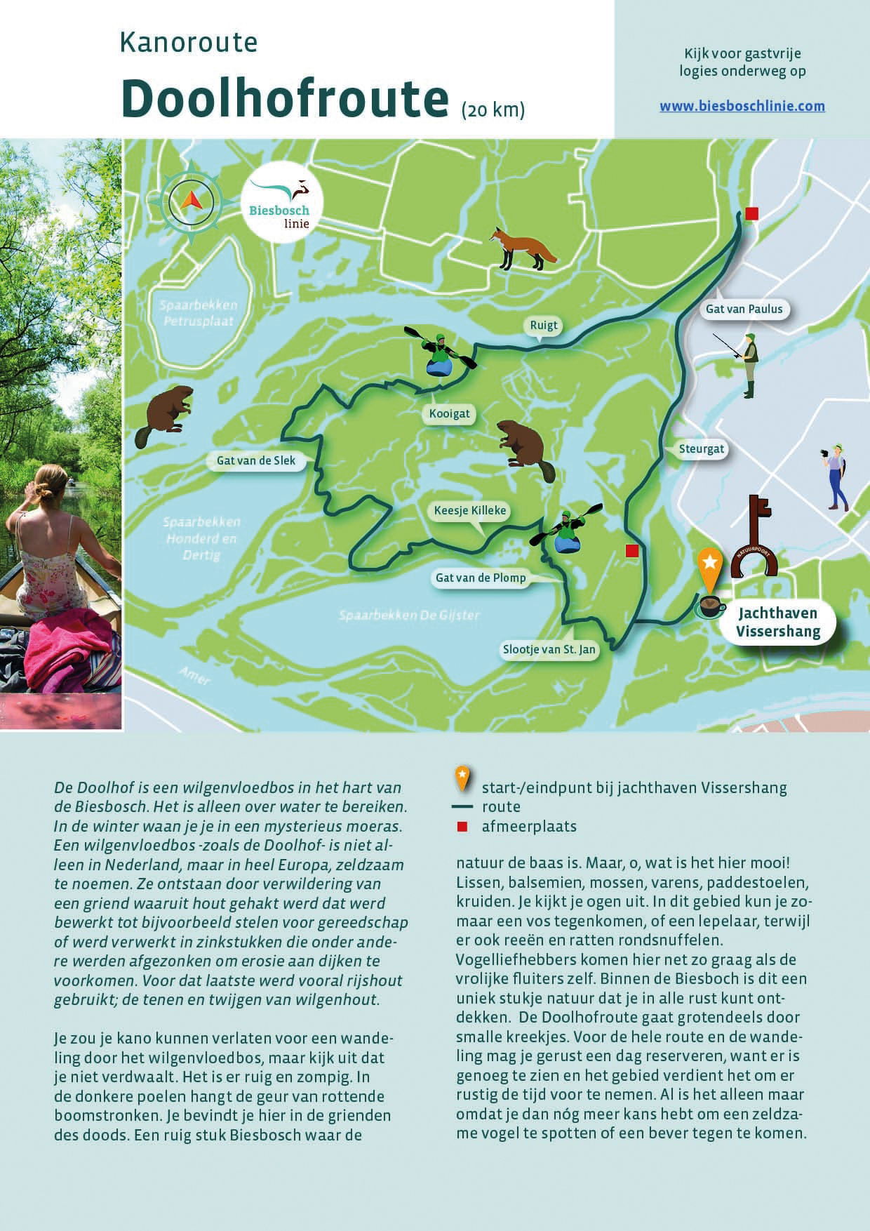 Vogelliefhebbers komen hier net zo graag als de vrolijke fluiters zelf. Binnen de Biesboch is dit een uniek stukje natuur dat je in alle rust kunt ontdekken. De Doolhofroute gaat grotendeels door smalle kreekjes. Voor de hele route en de wandeling mag je gerust een dag reserveren, want er is genoeg te zien en het gebied verdient het om er rustig de tijd voor te nemen. Al is het alleen maar omdat je dan nóg meer kans hebt om een zeldzame vogel te spotten of een bever tegen te komen.
